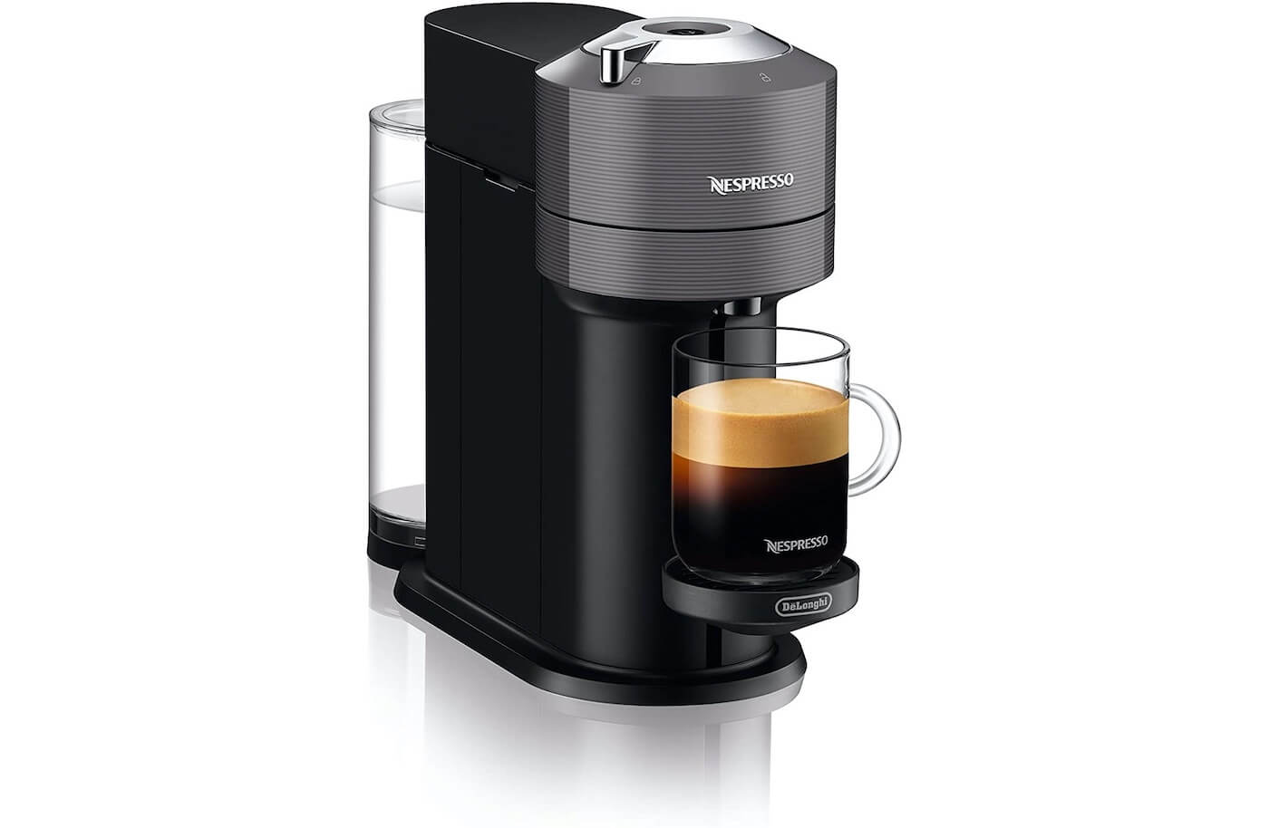 De'Longhi Vertuo Next能提供新鲜酿制的咖啡和奶油以及美味可口的浓缩咖啡。水箱从机器侧面旋转到机器后部,以便在台面上进行定制。配备一个电动头,只需轻触按钮即可打开和关闭。